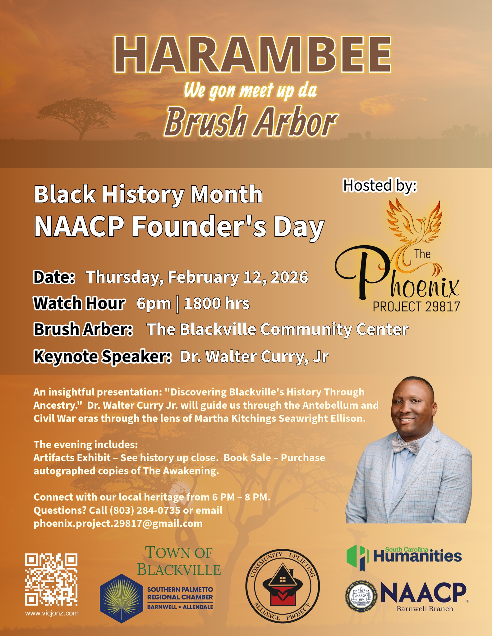 Blackville Community Center 194464 Solomon Blatt Avene, BlackvilleYou are welcome to HARAMBEE; this coming Thursday, February 12, 2026, 6pm @ the Blackville Community Center, Blackville SC! Help us celebrate Black History Month & The NAACP Founder's Day, […]